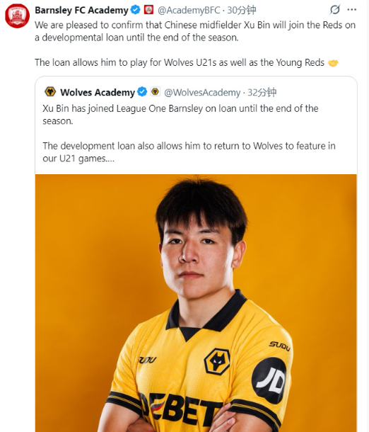 随后,巴恩斯利青年队官方账号转载了狼队宣布徐彬离队的推特,并且表示“徐彬将以发展性租借形式加盟球队,租期至本赛季结束。此次租借期间,徐彬可代表狼队U21梯队及本队青年军出战。”